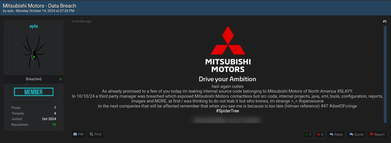 ayla has Allegedly Leaked the Data of Mitsubishi Motors North America, Inc.