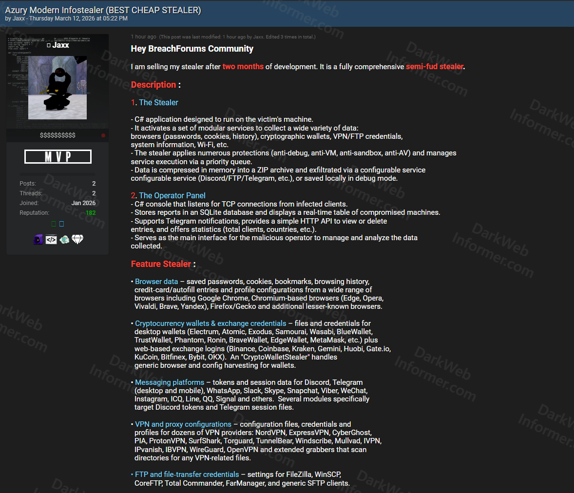 A threat actor going by Jaxx is selling the complete source code for a C# infostealer called Azury, described as a semi-FUD (fully undetectable) stealer built over two months of development. The package includes the stealer itself and a dedicated C# operator panel for managing infected machines, for $100.