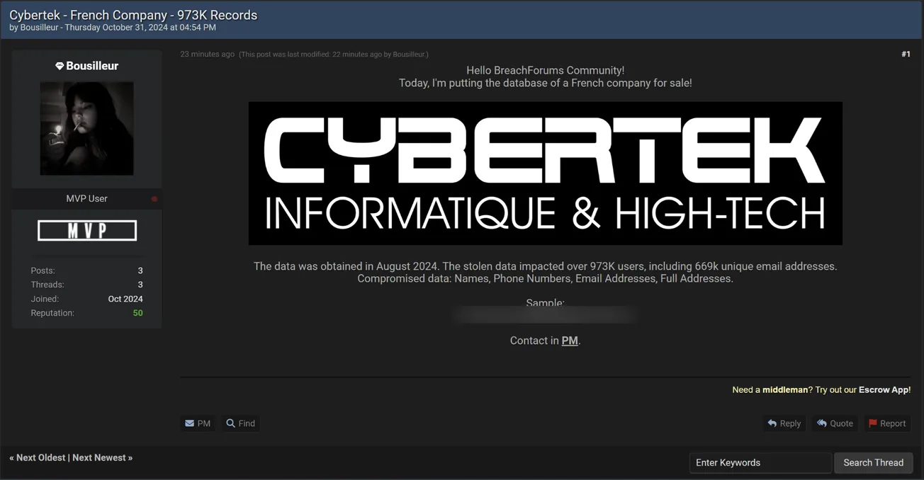 Bousilleur is Allegedly Selling the Data of Cybertek