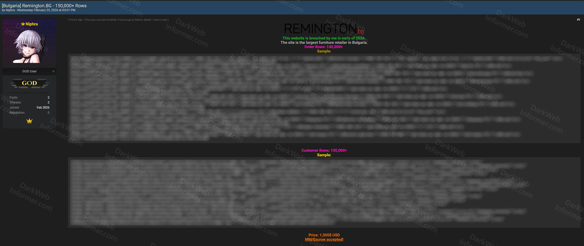 A threat actor using the handle Niphra claims to have breached Remington.bg, which they describe as the largest furniture retailer in Bulgaria, in early 2026. The listing includes two datasets: over 140,000 order rows and over 130,000 customer rows. The order data contains names, phone numbers, email addresses, physical addresses with city details, order status, completion timestamps, delivery notes, and pricing information in Bulgarian. The customer data includes names, email addresses, phone numbers, contact metadata, and account timestamps. Sample rows are provided for both tables. The asking price is $1,500 USD with payment accepted via MM/Escrow.