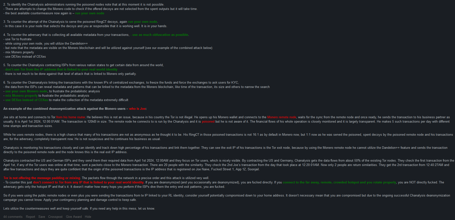 Joe sits at home and connects to Tor from his home router. He believes this is not an issue, because in his country the Tor is not illegal. He opens up his Monero wallet and connects to the Monero remote node, waits for the sync from the remote node and once ready, he sends the transaction to his business partner as usually. It is April 1st 2024, 12:00:01AM. The transaction is 120kB in size. The remote node he connects to is run by the Chanalysis and it is poisoned but he is not aware of it. The financial flows of his whole operation is closely monitored and it is largely transparent. He makes 5 such transactions per day with different time stamps and transaction sizes.