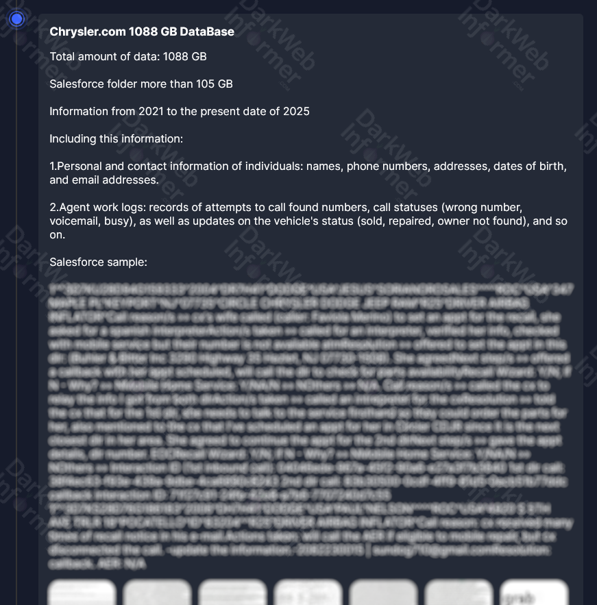The threat actor has provided sample data demonstrating the authenticity of their claims, including detailed customer interaction logs from Chrysler dealerships showing agent communications, customer service records, and vehicle sales information.