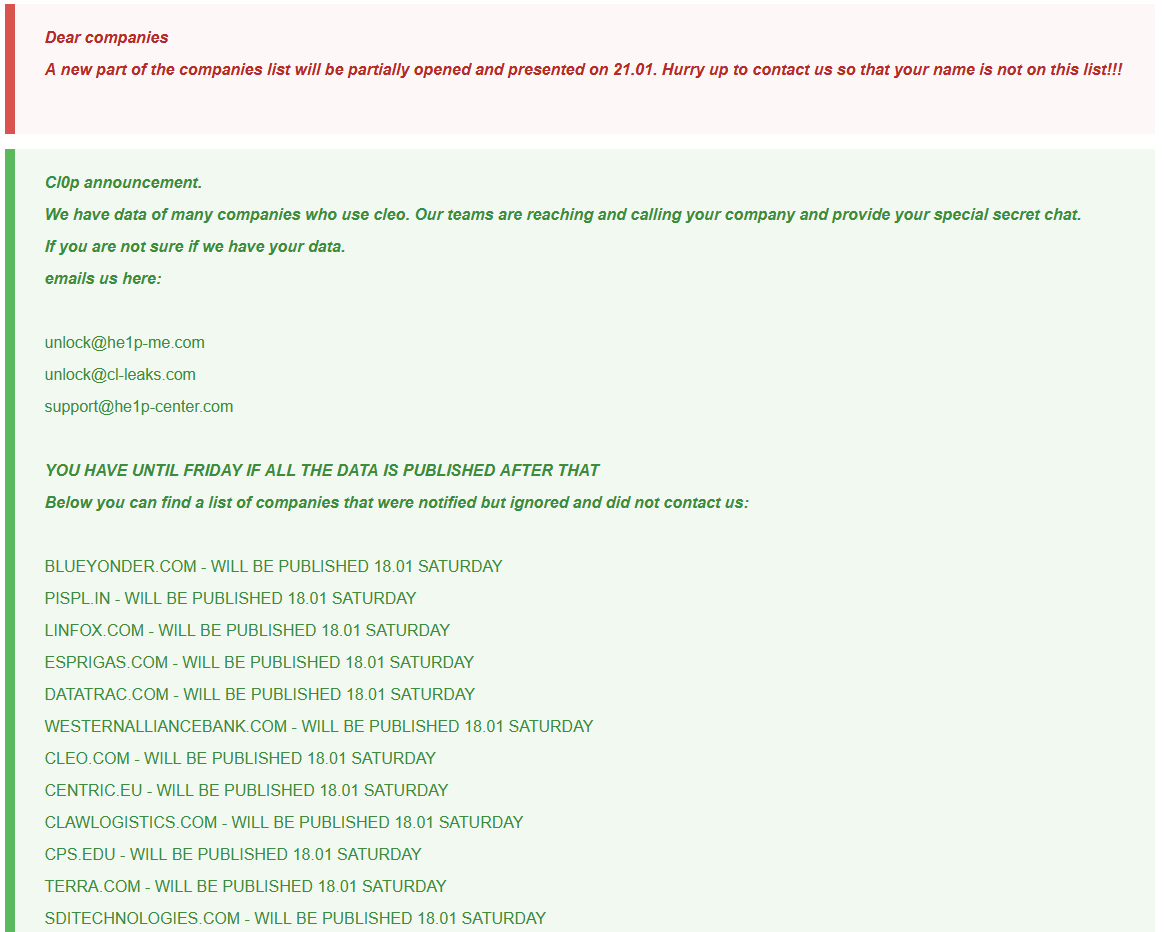 Cl0p Ransomware released a list of companies related to the Cleo exploit that will be publishes on the 18th of January 2025. Another new list will be partially opened and presented on the 21st of January 2025.