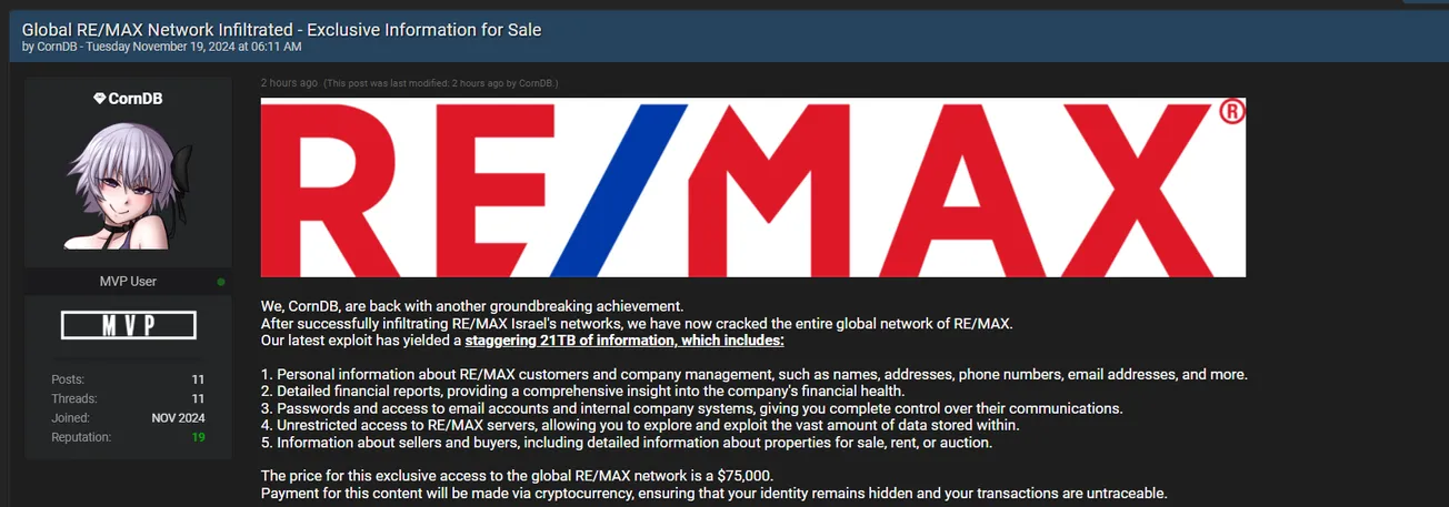 CornDB is Allegedly Selling Server Access and 21TB of Data of RE/MAX USA