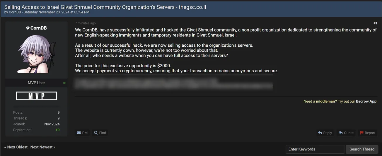 CornDB is Claiming to Sell Access of Givat Shmuel Community (GSC)
