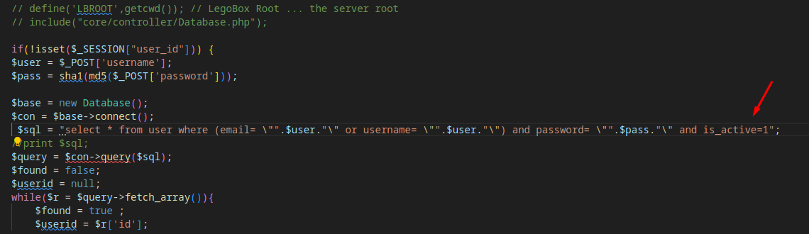 $sql = "select * from user where (email= \"".$user."\" or username= \"".$user."\") and password= \"".$pass."\" and is_active=1";