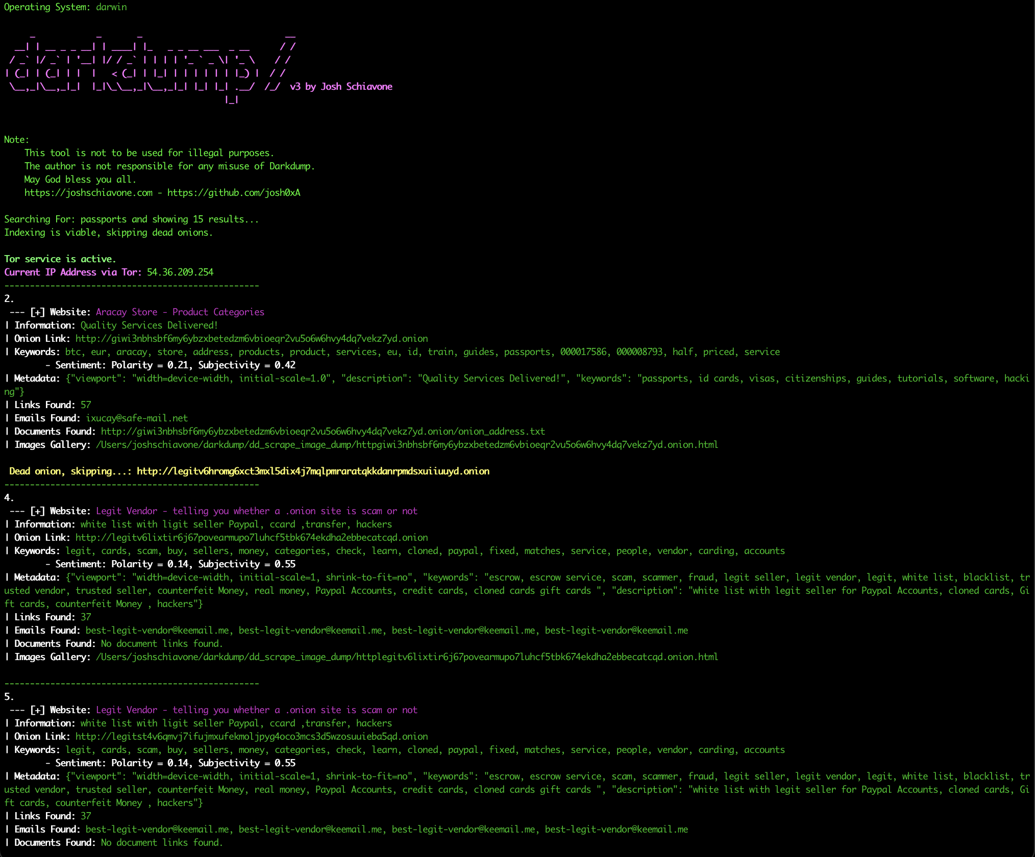 python3 darkdump.py -q "hacking" -a 10 --scrape --proxy - search for 10 links and scrape each sitepython3 darkdump.py -q "free movies" -a 25 - don't scrape, just return 25 links for that query (does not require tor)python3 darkdump.py -q "marketplaces" -a 15 --scrape --proxy -i - search for 10 links and scrape each site as well as find and store images.