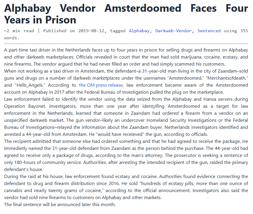 ~2 min read | Originally Published on 2019-08-12, tagged Alphabay, Darkweb-Vendor, Sentenced. Using 355 words.
