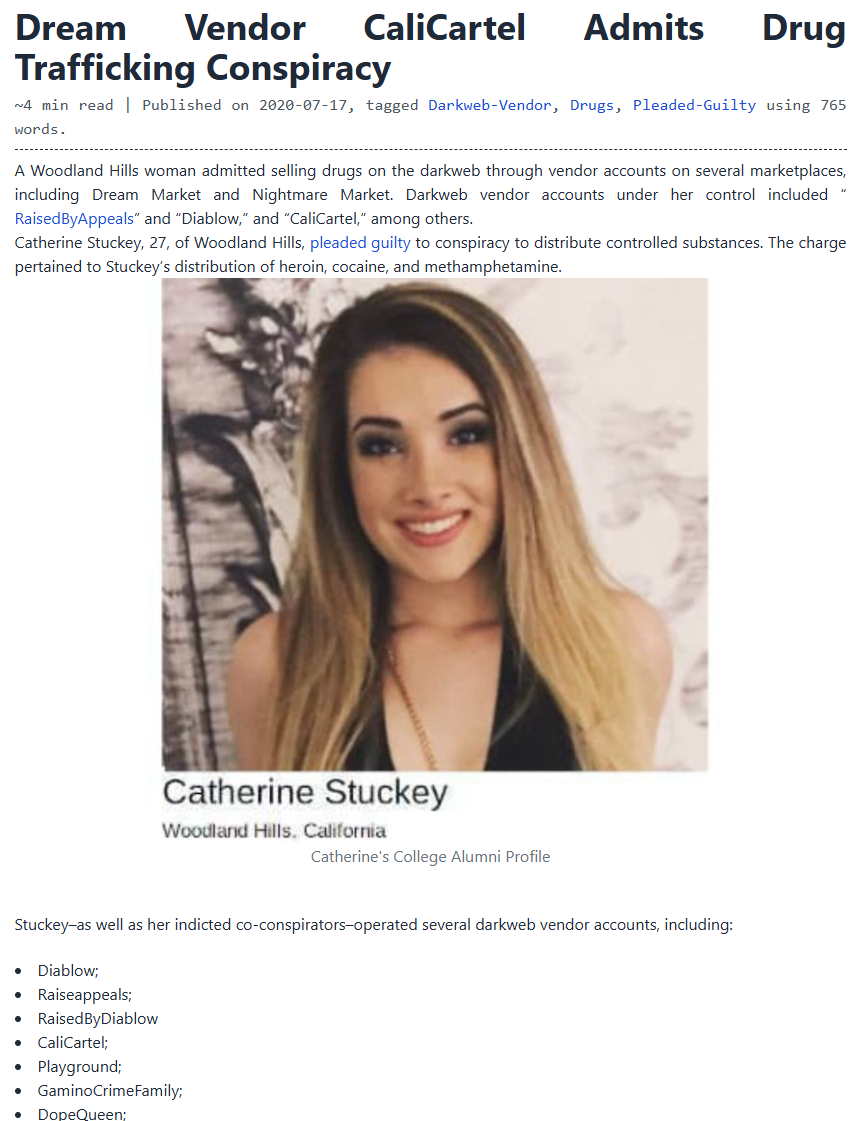A Woodland Hills woman admitted selling drugs on the darkweb through vendor accounts on several marketplaces, including Dream Market and Nightmare Market. Darkweb vendor accounts under her control included “RaisedByAppeals” and “Diablow,” and “CaliCartel,” among others.