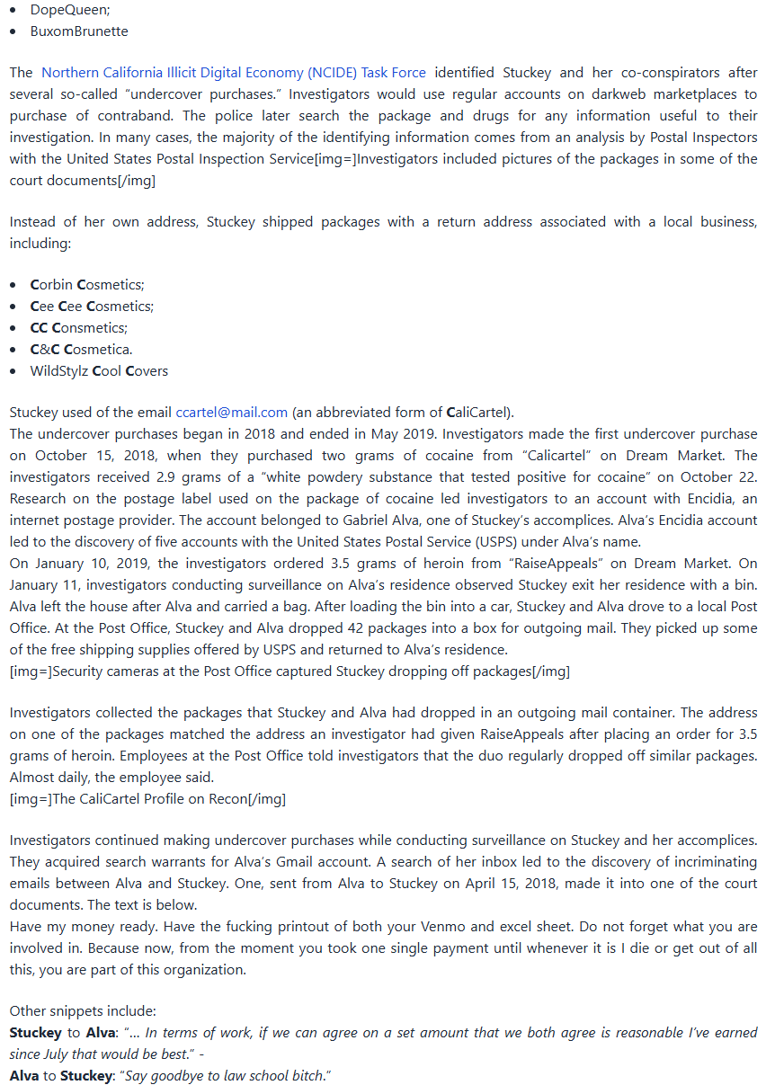 The Northern California Illicit Digital Economy (NCIDE) Task Force identified Stuckey and her co-conspirators after several so-called “undercover purchases.” Investigators would use regular accounts on darkweb marketplaces to purchase of contraband. The police later search the package and drugs for any information useful to their investigation. In many cases, the majority of the identifying information comes from an analysis by Postal Inspectors with the United States Postal Inspection Service[img=]Investigators included pictures of the packages in some of the court documents[/img]