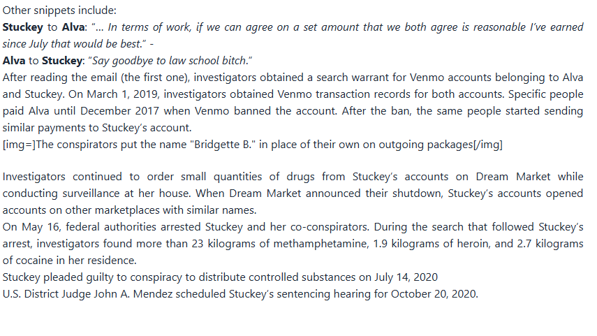 Investigators continued to order small quantities of drugs from Stuckey’s accounts on Dream Market while conducting surveillance at her house. When Dream Market announced their shutdown, Stuckey’s accounts opened accounts on other marketplaces with similar names.