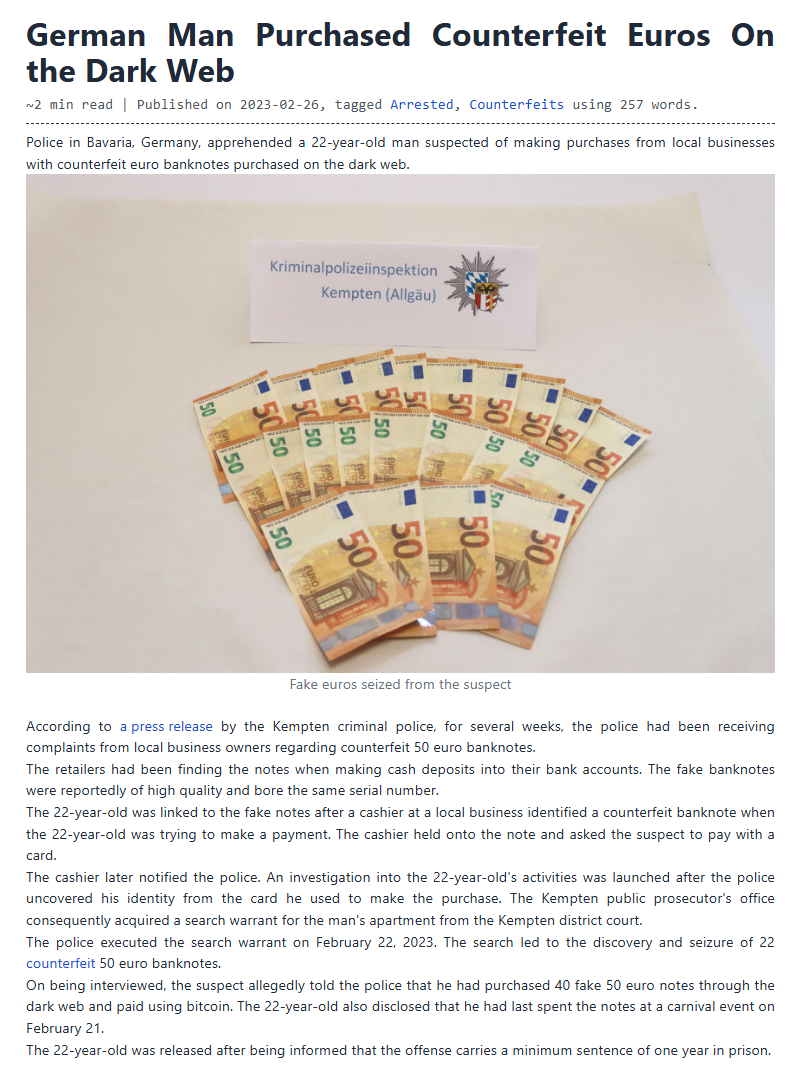Police in Bavaria, Germany, apprehended a 22-year-old man suspected of making purchases from local businesses with counterfeit euro banknotes purchased on the dark web.