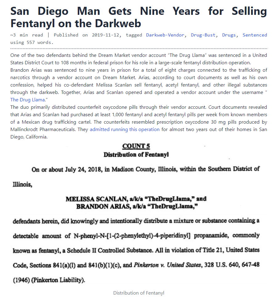 Brandon Arias was sentenced to nine years in prison for a total of eight charges connected to the trafficking of narcotics through a vendor account on Dream Market. Arias, according to court documents as well as his own confession, helped his co-defendant Melissa Scanlan sell fentanyl, acetyl fentanyl, and other illegal substances through the darkweb. Together, Arias and Scanlan opened and operated a vendor account under the username “The Drug Llama.”