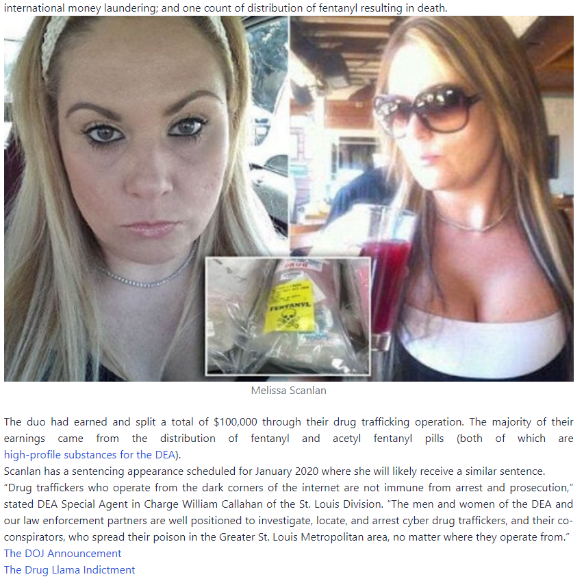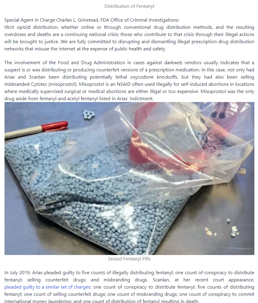 The involvement of the Food and Drug Administration in cases against darkweb vendors usually indicates that a suspect is or was distributing or producing counterfeit versions of a prescription medication. In this case, not only had Arias and Scanlan been distributing potentially lethal oxycodone knockoffs, but they had also been selling misbranded Cytotec (misoprostol). Misoprostol is an NSAID often used illegally for self-induced abortions in locations where medically supervised surgical or medical abortions are either illigal or too expensive. Misoprostol was the only drug aside from fentanyl and acetyl fentanyl listed in Arias’ indictment.