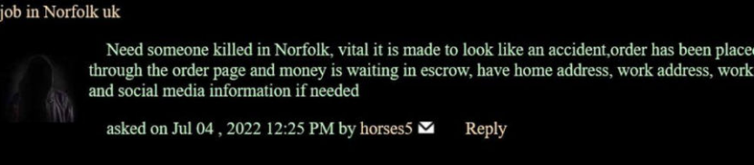 According to media reports, 43-year-old Helen Hewlett, of Norfolk, UK, deposited more than £20,000 to a fraudulent murder-for-hire site on the dark web called Online Killers Market and placed an order for a hit on 50-year-old Paul Belton.