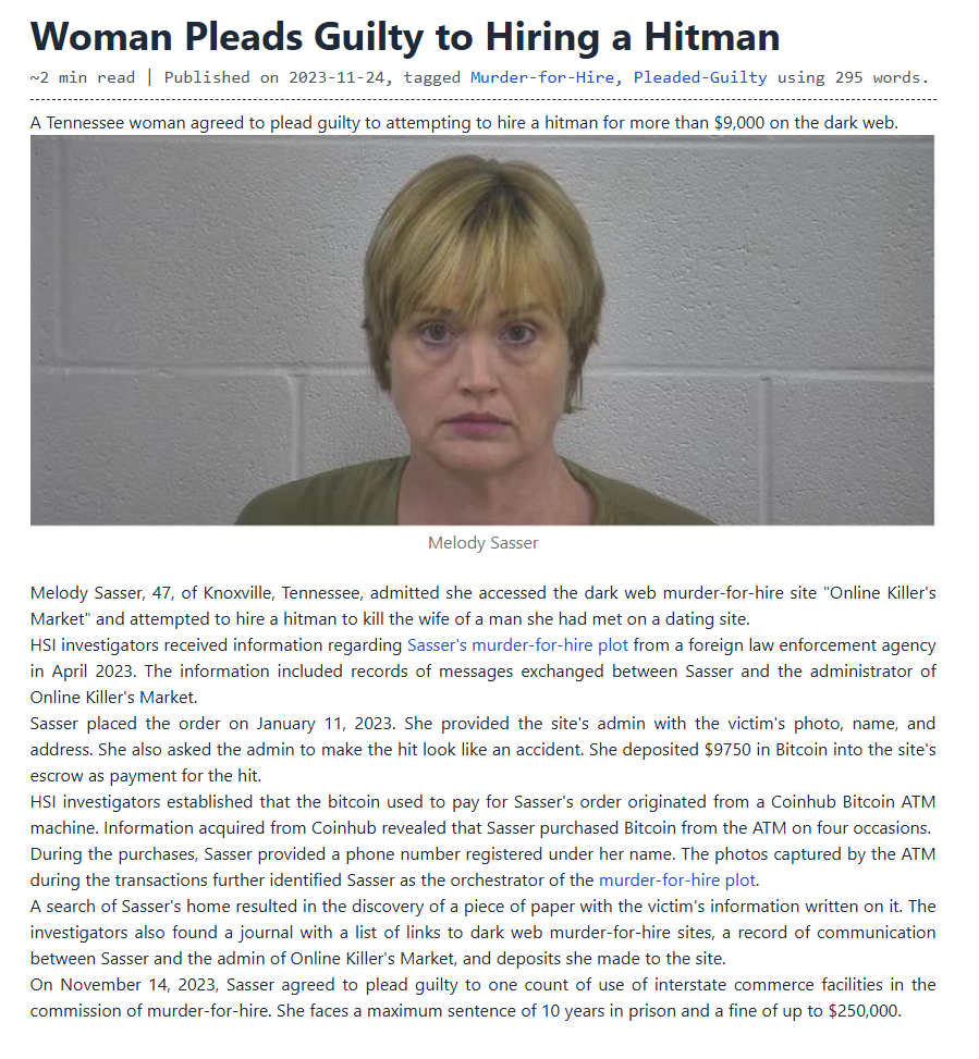 Melody Sasser, 47, of Knoxville, Tennessee, admitted she accessed the dark web murder-for-hire site "Online Killer's Market" and attempted to hire a hitman to kill the wife of a man she had met on a dating site.