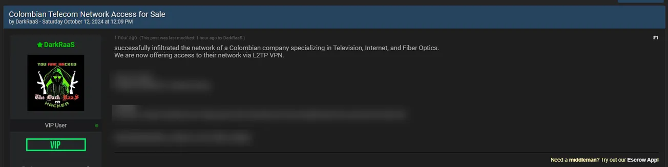 DarkRaaS is Allegedly Selling Access to a Colombian Telecom Network