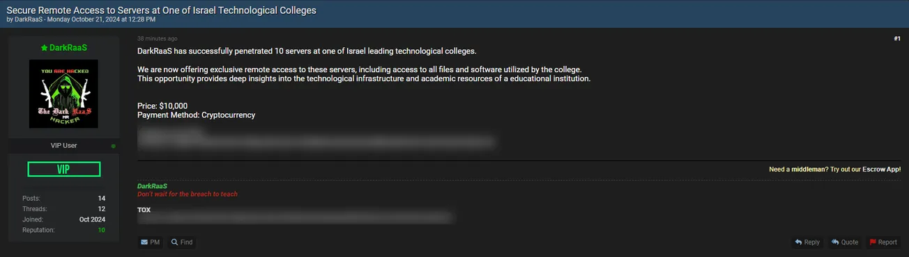 DarkRaaS is Allegedly Selling Access to an Unidentified Israeli Technological College