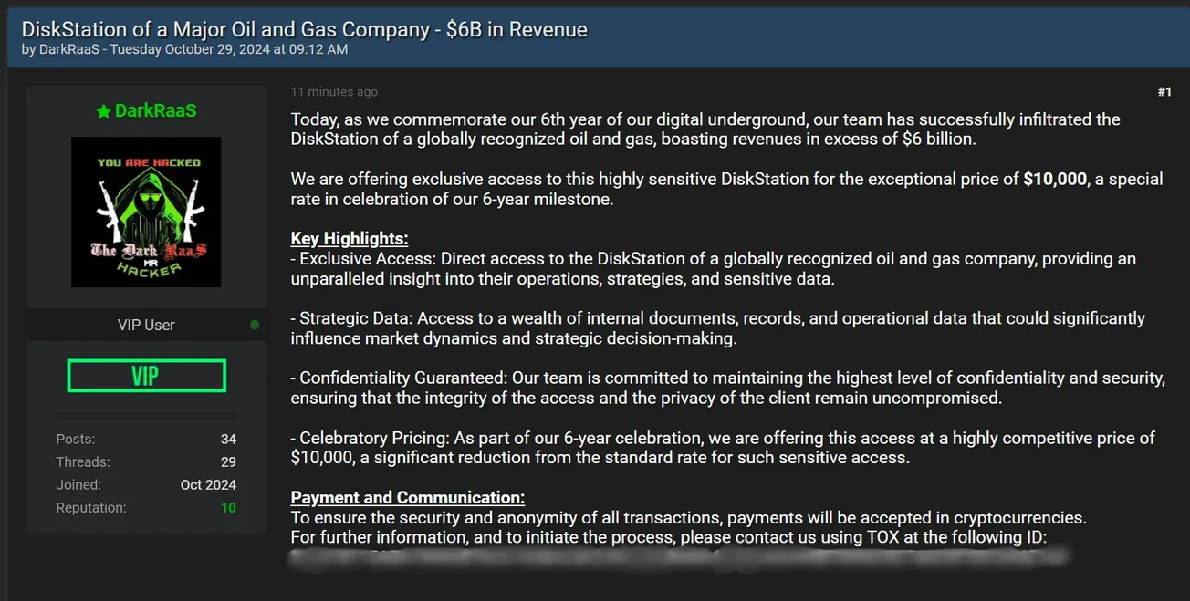 DarkRaaS is Allegedly Selling Access to an Unidentified Oil and Gas Company