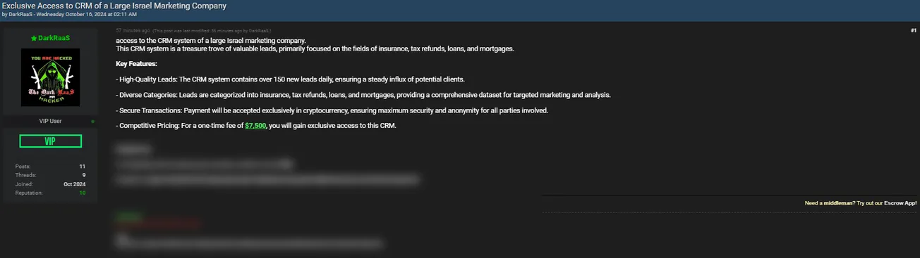 DarkRaaS is Allegedly Selling Access to the CRM System of an Israeli Marking Company
