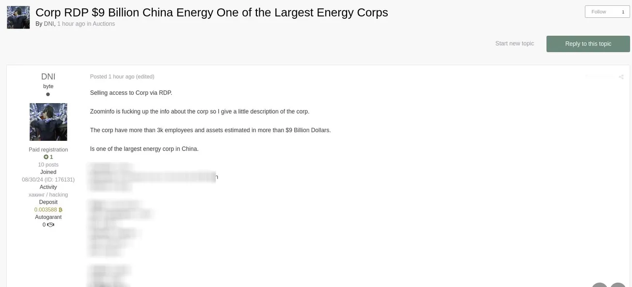 🚨 Title: Alleged RDP access sale of Energy Corp in China