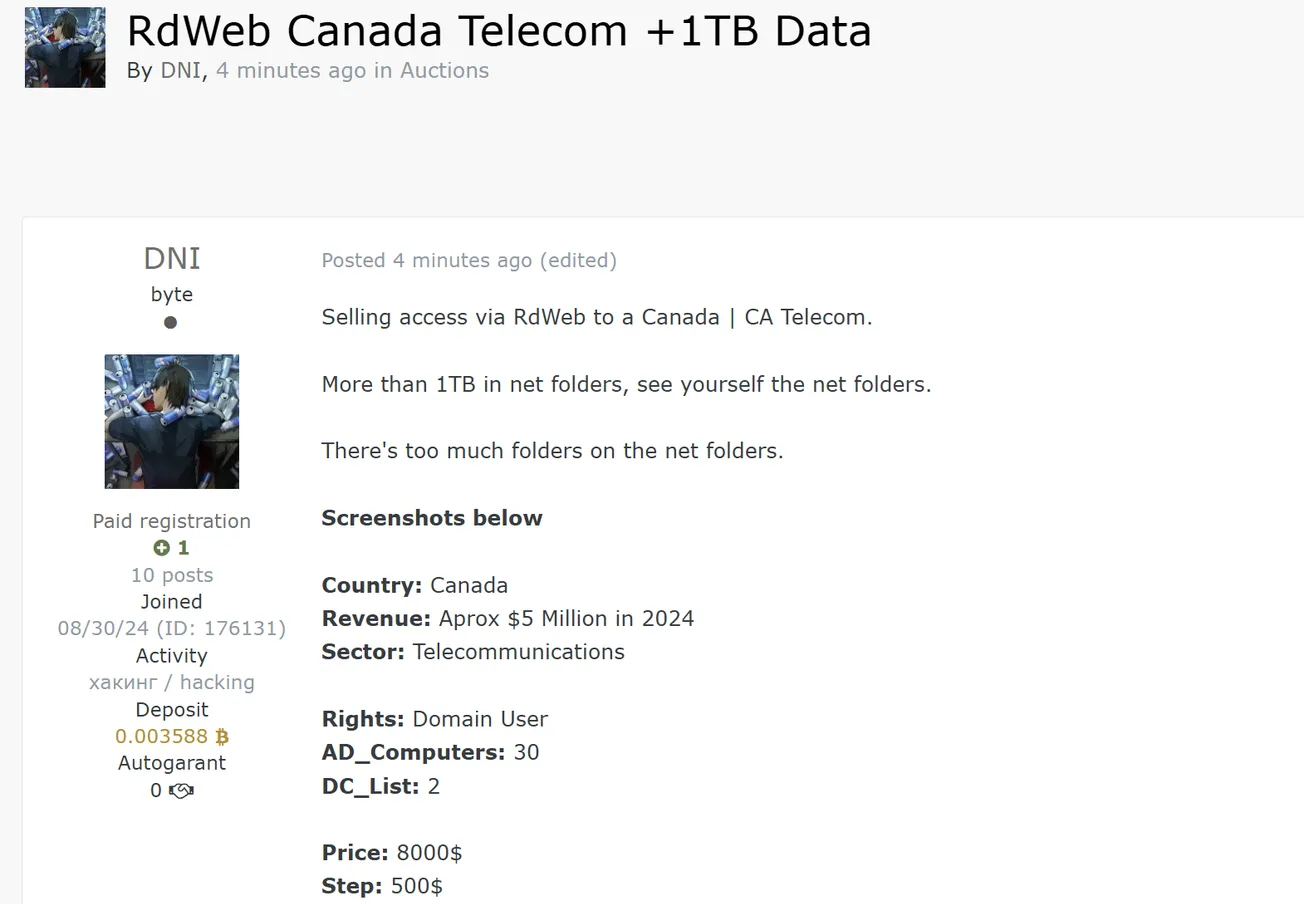 🚨 Title: Alleged RDWeb access sale of an unidentified Telecom company in Canada