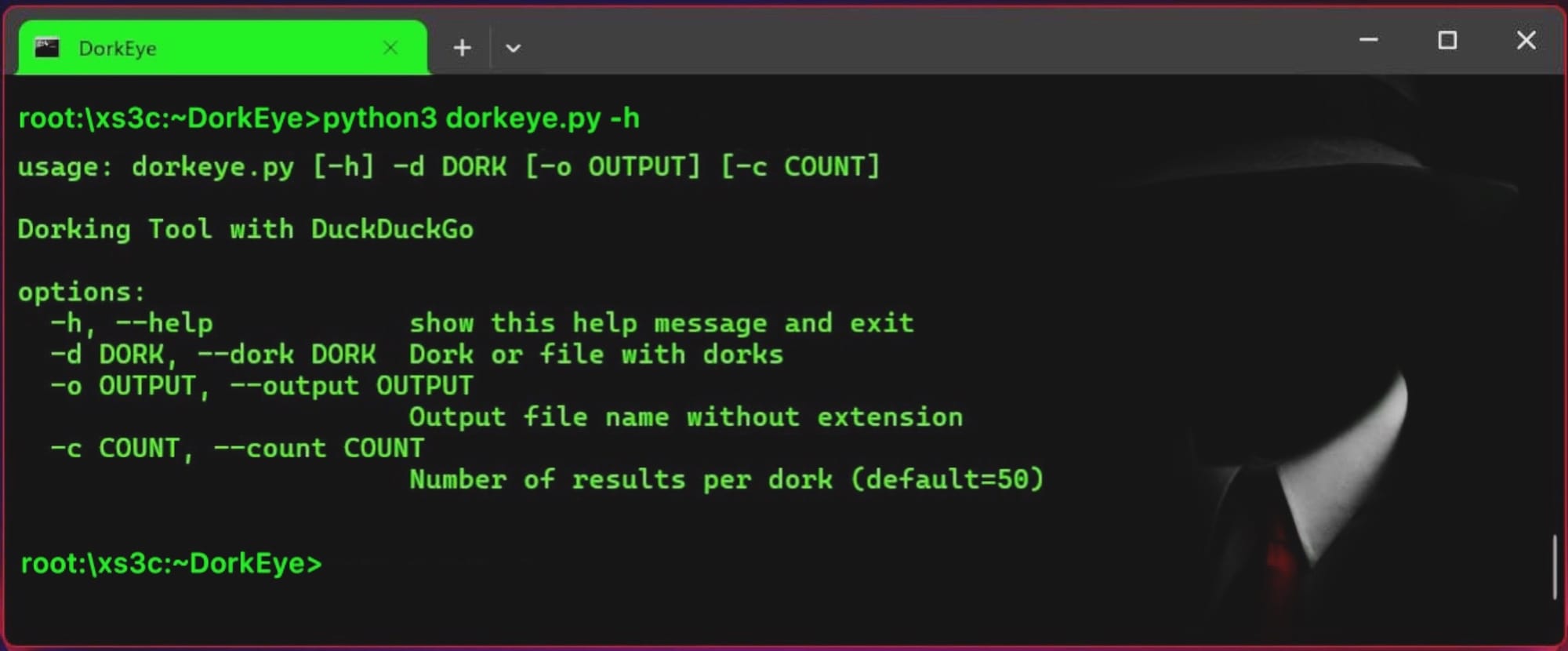 DorkEye/├── dorkeye.py├── requirements.txt├── README.md├── dorks.txt # (optional)└── results.txt # (generated output)
