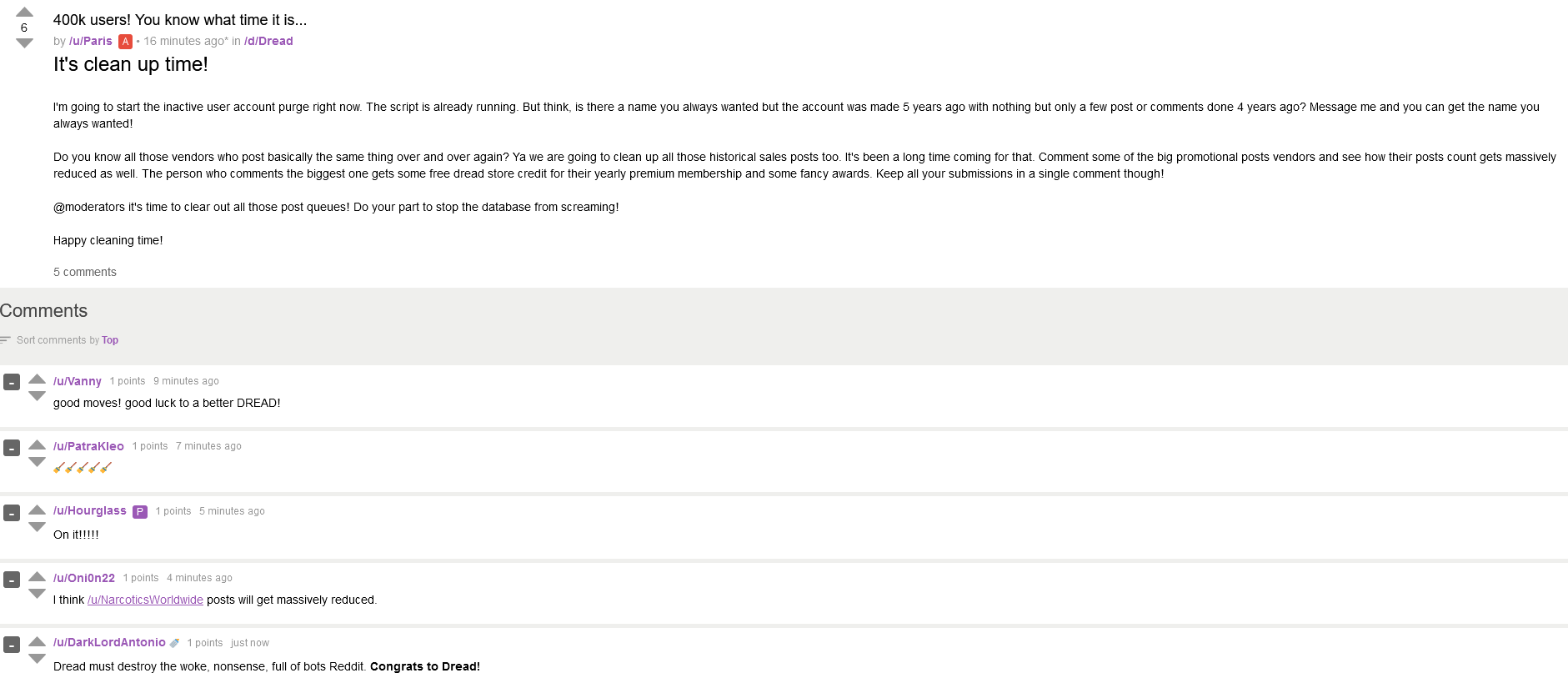 Paris announces an update, reaching 400,000 users on Dread, with a cleanup currently underway!