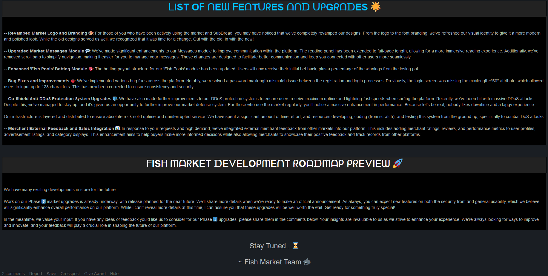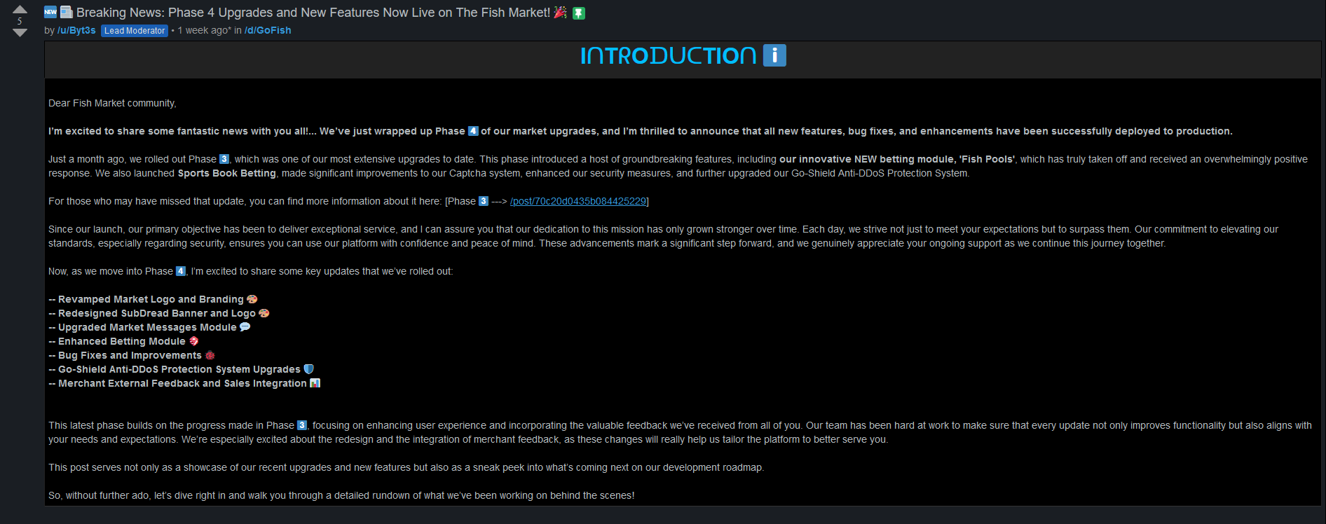Just a month ago, we rolled out Phase 3, which was one of our most extensive upgrades to date. This phase introduced a host of groundbreaking features, including our innovative NEW betting module, 'Fish Pools,' which has truly taken off and received an overwhelmingly positive response. We also launched Sports Book Betting, made significant improvements to our Captcha system, enhanced our security measures, and further upgraded our Go-Shield Anti-DDoS Protection System.