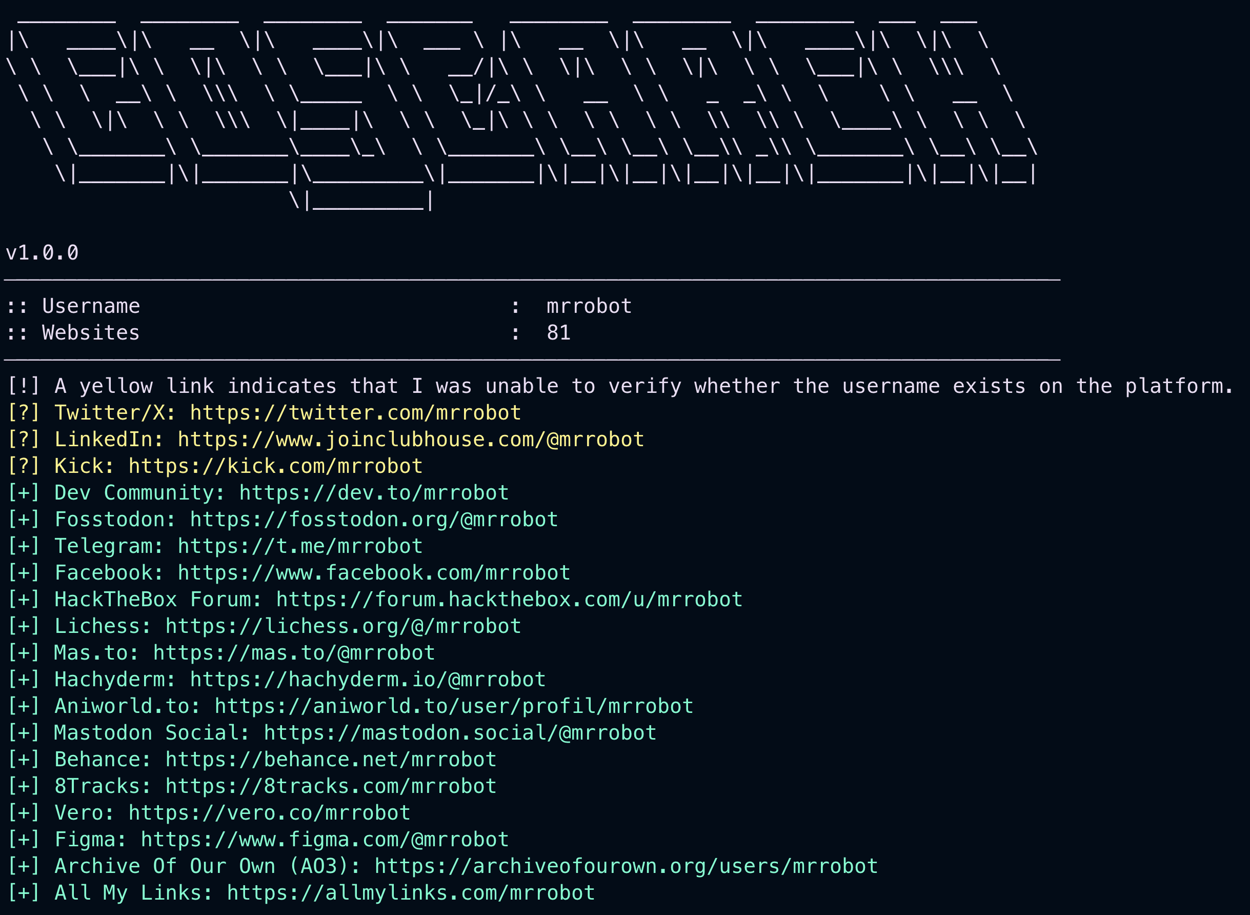 GoSearch is inspired by Sherlock, a popular username search tool. However, GoSearch improves upon Sherlock by addressing several of its key limitations: