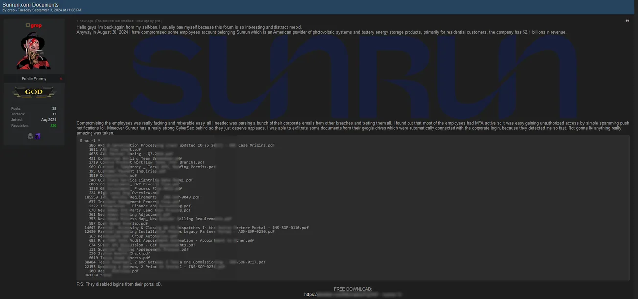 Anyway, in August 30, 2024, I have compromised some employees' accounts belonging to Sunrun, which is an American provider of photovoltaic systems and battery energy storage products, primarily for residential customers. The company has $2.1 billion in revenue.