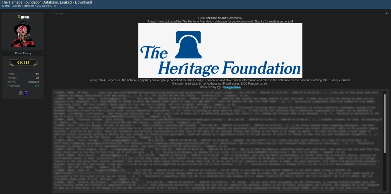 In July 2024, SiegedSec, the notorious gay furry hacker group, breached The Heritage Foundation and stole critical information. The leaked database for the company contains 73,073 unique emails.
