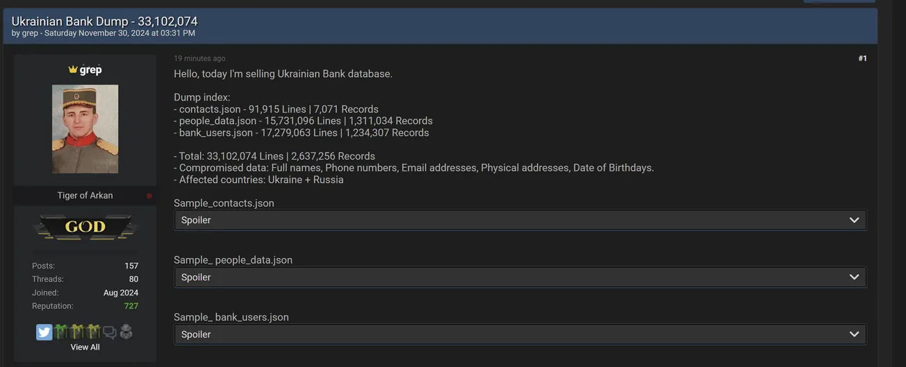 grep is Allegedly Selling Data of an Unidentified Bank in Ukraine
