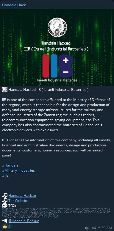 Handala has Allegedly Breached the Data of Israel Industrial Batteries