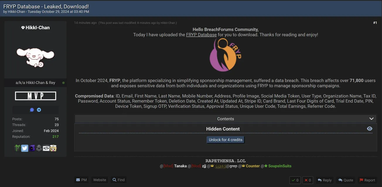 HikkI-Chan Has Allegedly Leaked the Database of FRYP