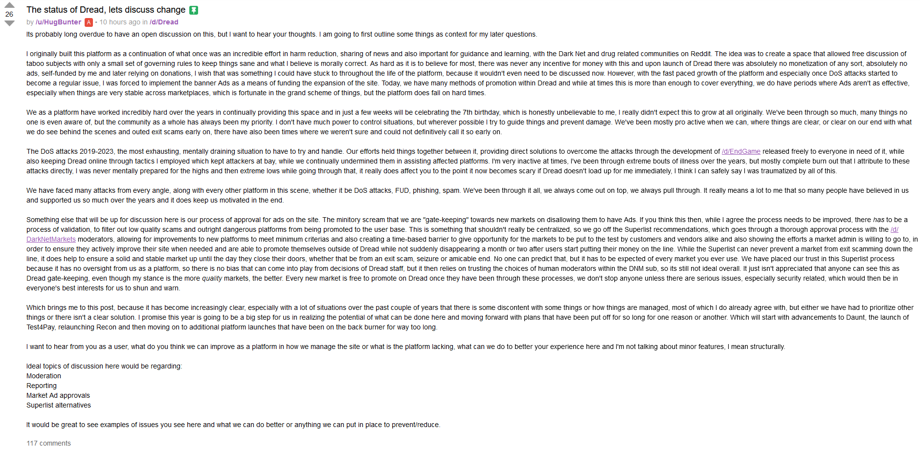 Something else that will be up for discussion here is our process of approval for ads on the site. The minitory scream that we are "gate-keeping" towards new markets on disallowing them to have Ads. If you think this then, while I agree the process needs to be improved, there has to be a process of validation, to filter out low quality scams and outright dangerous platforms from being promoted to the user base. This is something that shouldn't really be centralized, so we go off the Superlist recommendations, which goes through a thorough approval process with the /d/DarkNetMarkets moderators, allowing for improvements to new platforms to meet minimum criterias and also creating a time-based barrier to give opportunity for the markets to be put to the test by customers and vendors alike and also showing the efforts a market admin is willing to go to, in order to ensure they actively improve their site when needed and are able to promote themselves outside of Dread while not suddenly disappearing a month or two after users start putting their money on the line. While the Superlist can never prevent a market from exit scamming down the line, it does help to ensure a solid and stable market up until the day they close their doors, whether that be from an exit scam, seizure or amicable end. No one can predict that, but it has to be expected of every market you ever use. We have placed our trust in this Superlist process because it has no oversight from us as a platform, so there is no bias that can come into play from decisions of Dread staff, but it then relies on trusting the choices of human moderators within the DNM sub, so its still not ideal overall. It just isn't appreciated that anyone can see this as Dread gate-keeping, even though my stance is the more quality markets, the better. Every new market is free to promote on Dread once they have been through these processes, we don't stop anyone unless there are serious issues, especially security related, which would then be in everyone's best interests for us to shun and warn.