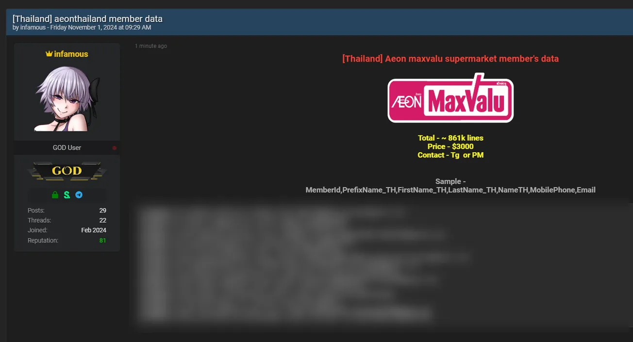 🚨 Title: Alleged Database sale of AEON MaxValu