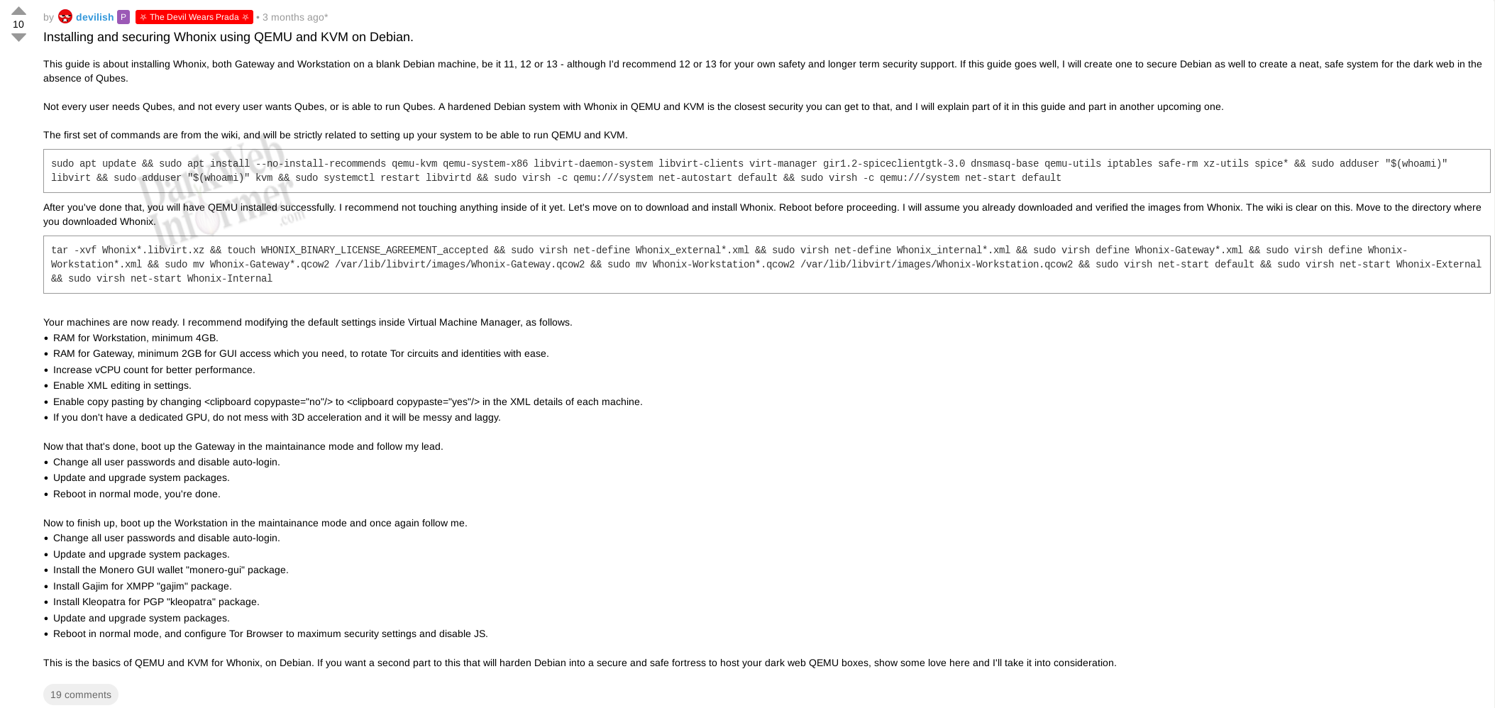 This is the basis of QEMU and KVM for Whonix, on Debian. If you want a second part to this that will harden Debian into a secure and safe fortress to host your dark web QEMU boxes, show some love here and I’ll take it into consideration."