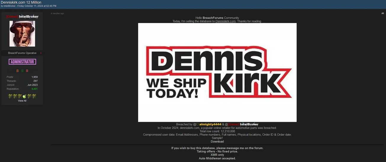IntelBroker and almighty4444 are Allegedly Selling the Database of Dennis Kirk
