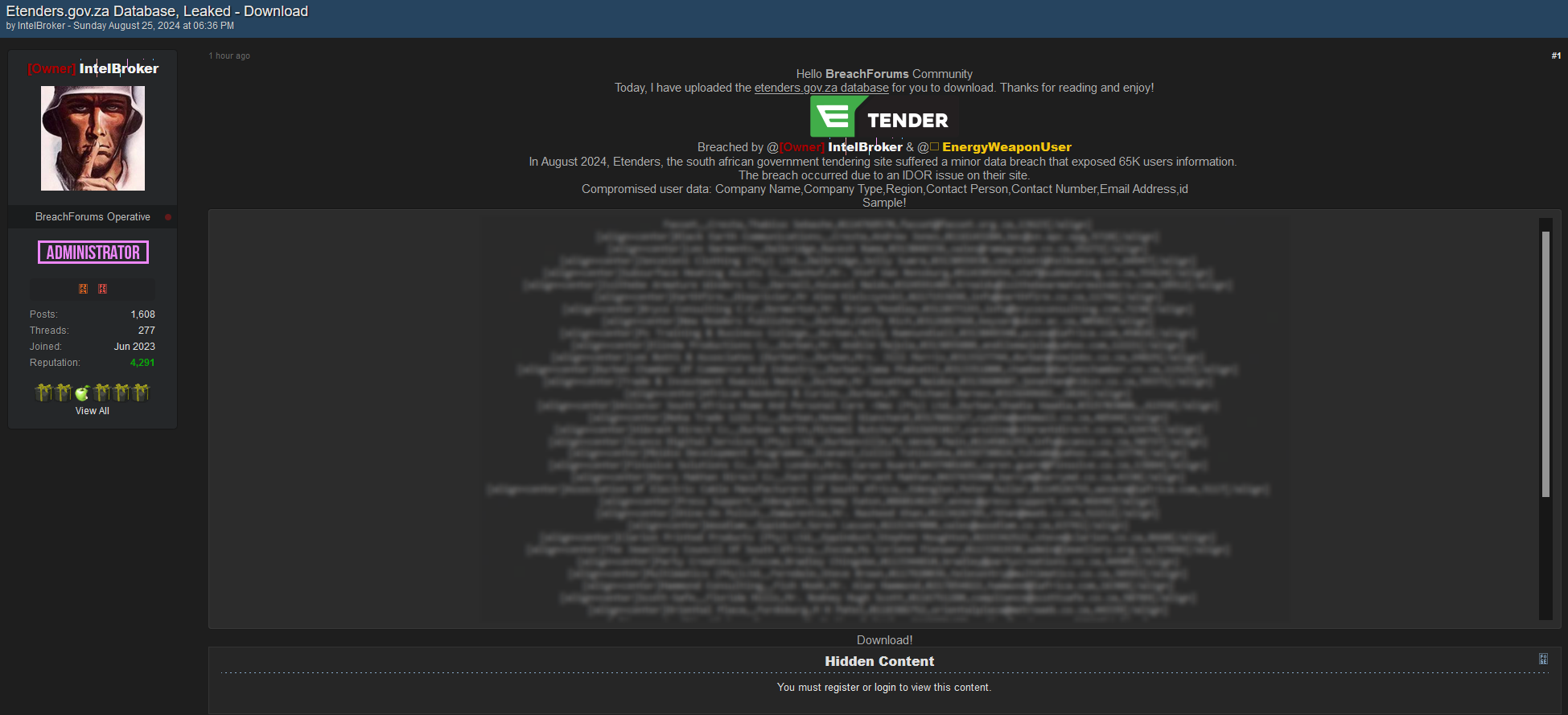 In August 2024, Etenders, the South African government tendering site, suffered a minor data breach that exposed 65K users' information. The breach occurred due to an IDOR issue on their site.