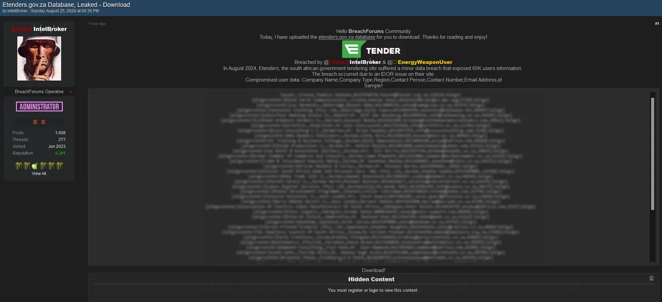 In August 2024, Etenders, the South African government tendering site, suffered a minor data breach that exposed 65K users' information. The breach occurred due to an IDOR issue on their site.