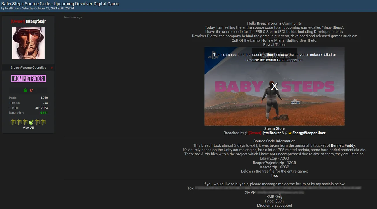 IntelBroker and EnergyWeaponUser are Allegedly Selling the Source Code of Baby Steps by Devolver Digital