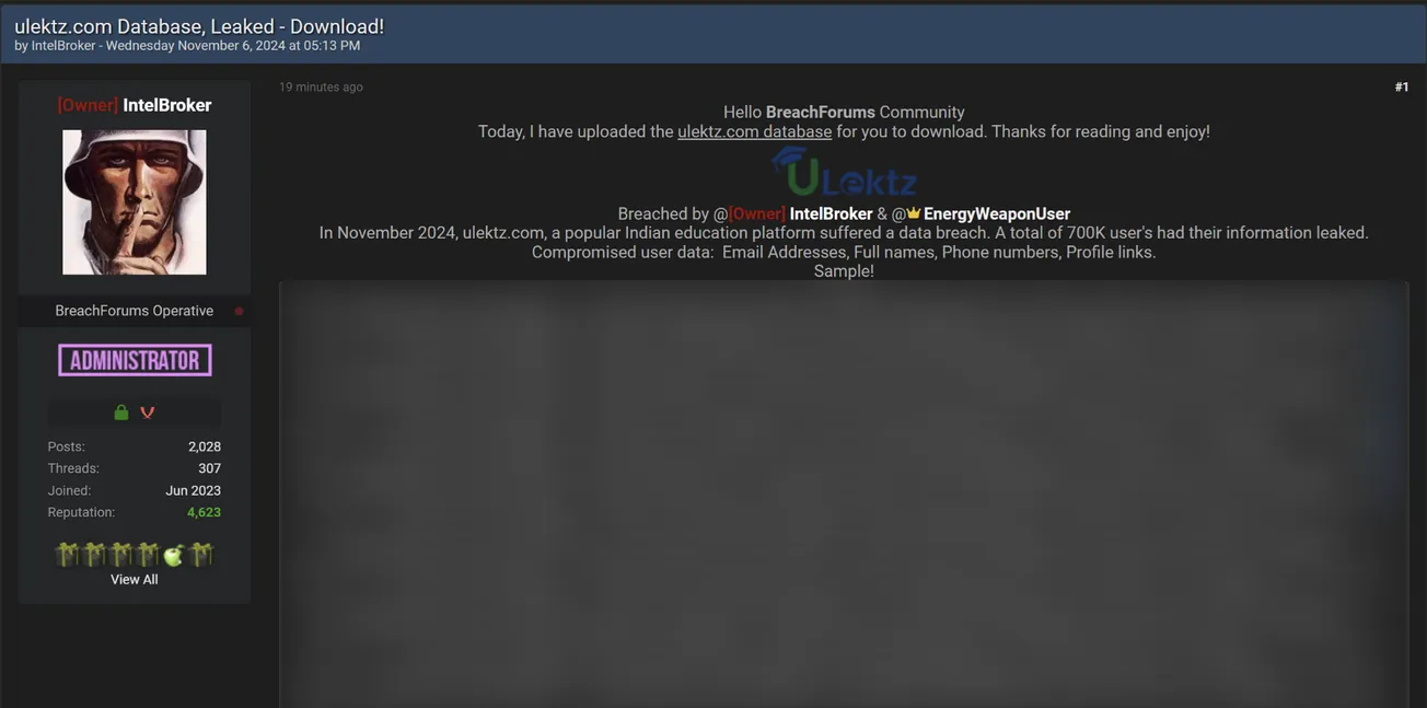 IntelBroker and EnergyWeaponUser Have Allegedly Leaked the Data of uLektz Learning Solutions Private Limited