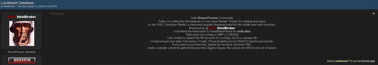 IntelBroker is Allegedly Selling the Database of LuluMarket