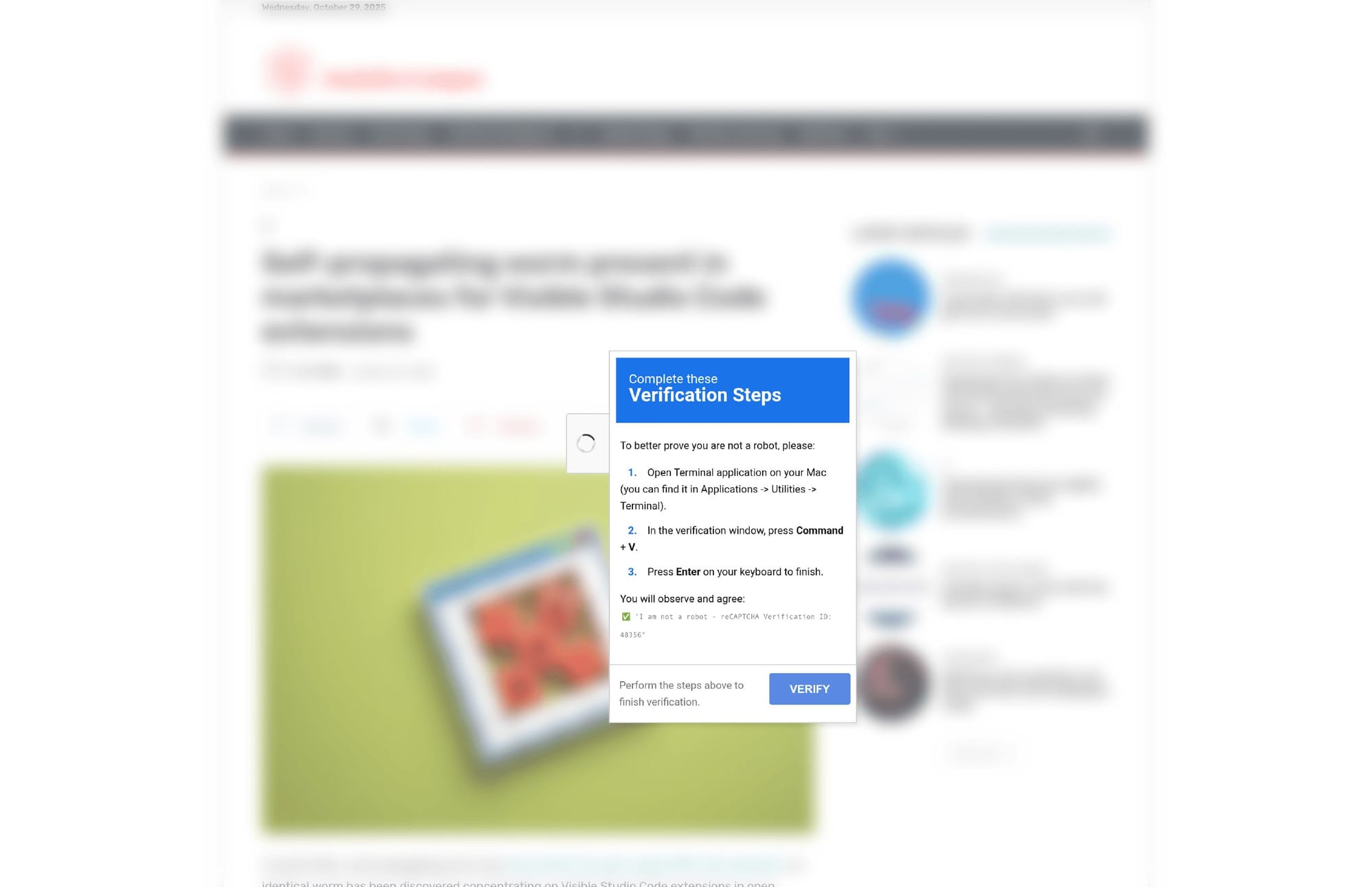 A malicious FakeCaptcha payload delivery was identified on a compromised webpage hosted at analyticscampus.com. The site masquerades as a legitimate technology article discussing a self-propagating Visual Studio Code worm, but instead presents a deceptive verification prompt instructing users to execute commands on macOS systems. This pattern is consistent with FakeCaptcha social engineering campaigns designed to trick users into executing remote payloads or granting command-line access. Confidence is assessed at 50%.