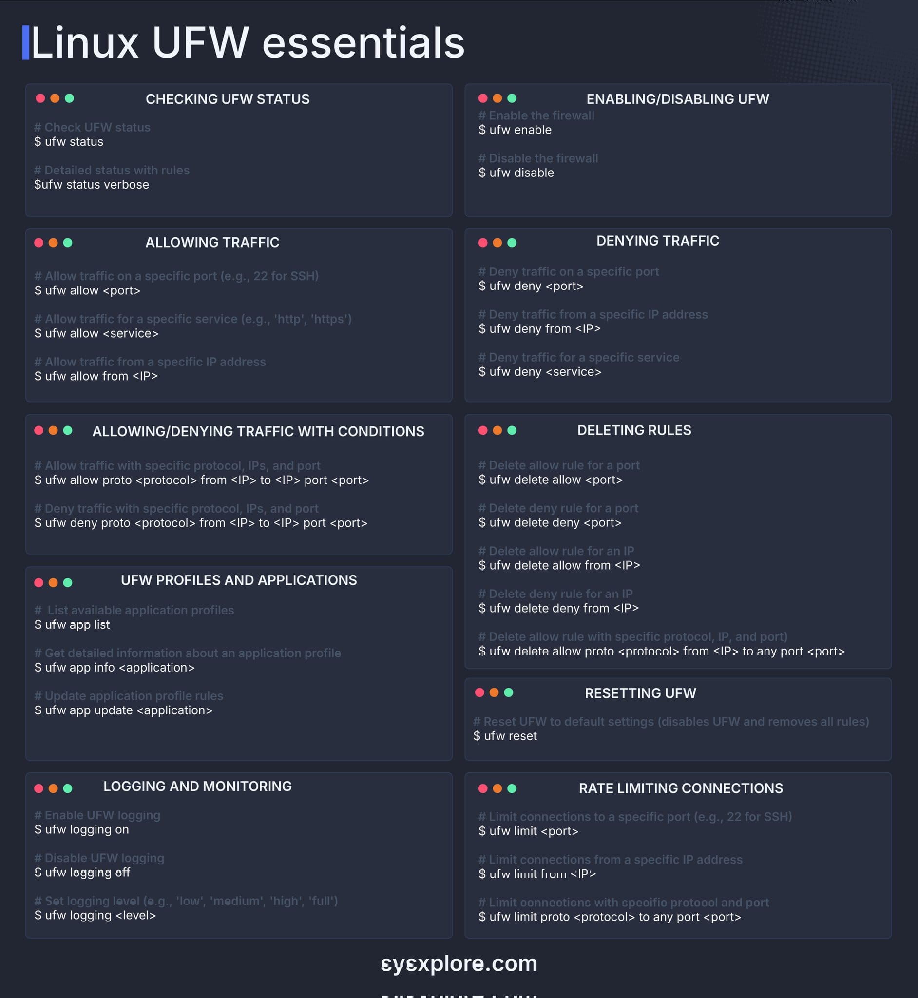 $ ufw limitfrom <IP> - Limit connections with specific protocol and port:bashCopyEdit