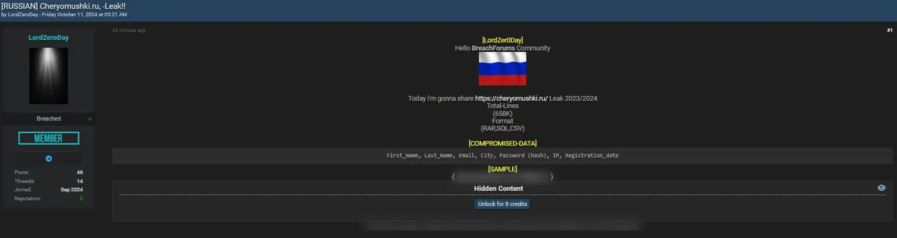 LordZeroDay has Allegedly Leaked the data of CHEREMUSHKI