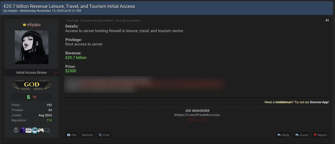 🚨 Title: Alleged server access sale of unidentified Tourism company